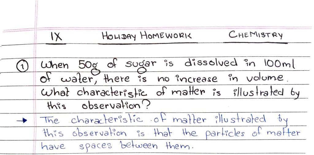 Q1. When 50g of sugar is dissolved in 100mL of water, there is no increase in volume. What characteristic of matter is illustrated by this observation?