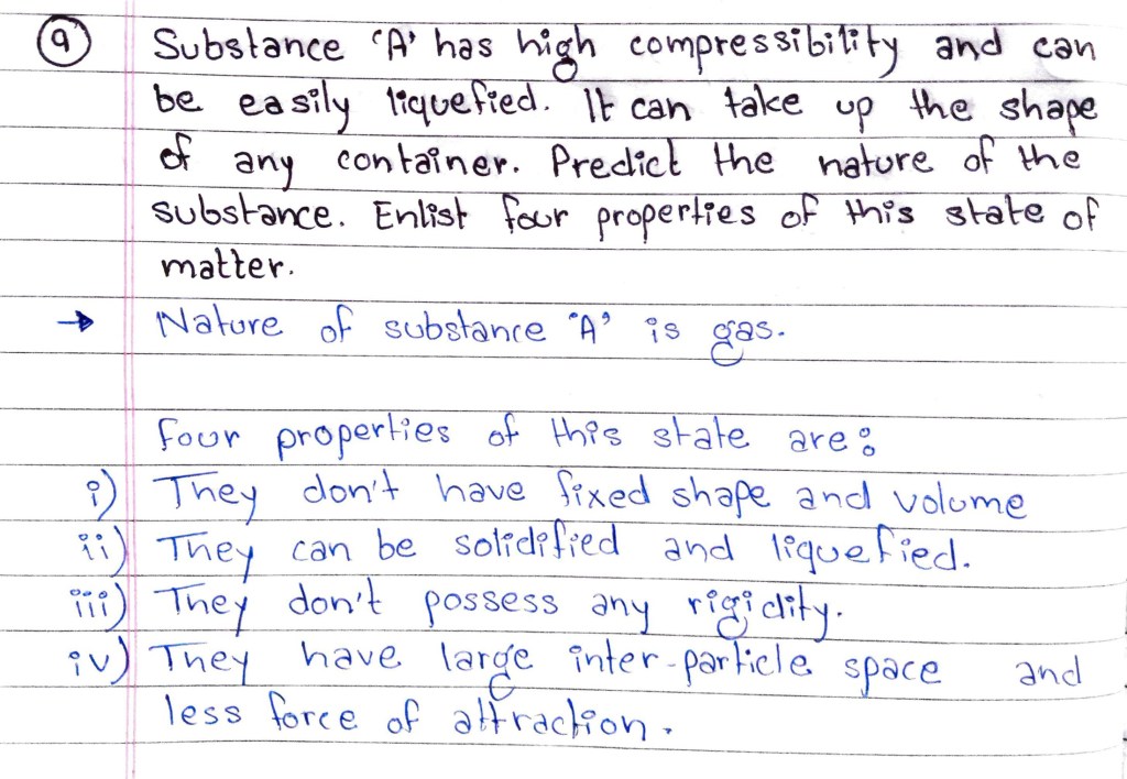 Q9. Substance ‘A’ has high compressibility and can be easily liquefied. It can take up the shape of any container. Predict The nature of the substance. Enlist four properties of this state of matter.