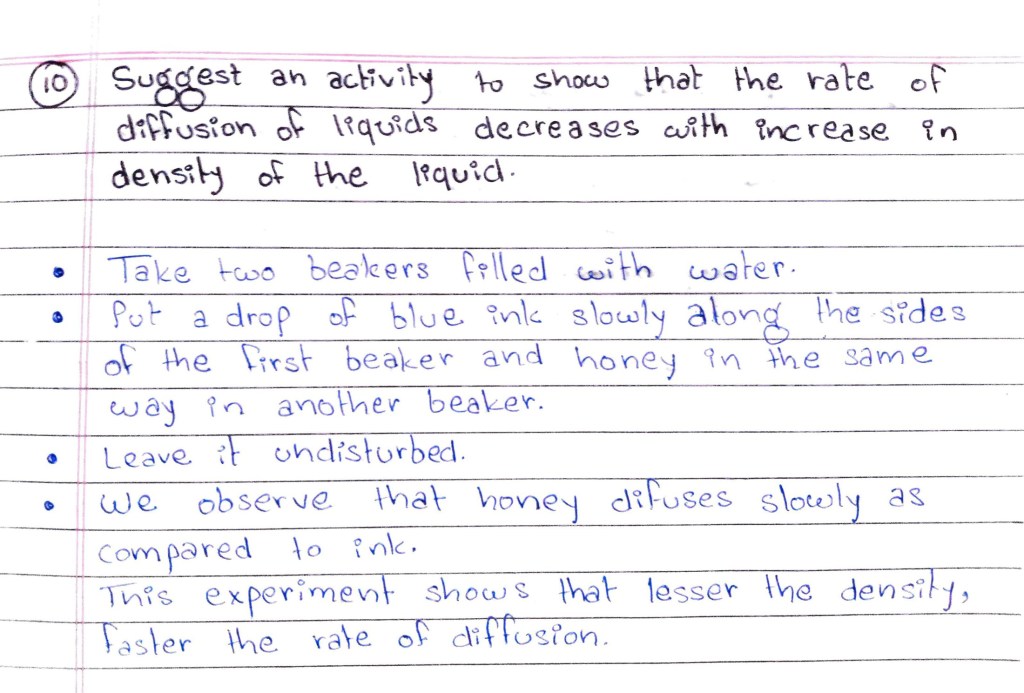 Q.10 Suggest an activity to show that the rate of diffusion of liquid decreases with increase in density of the liquid.