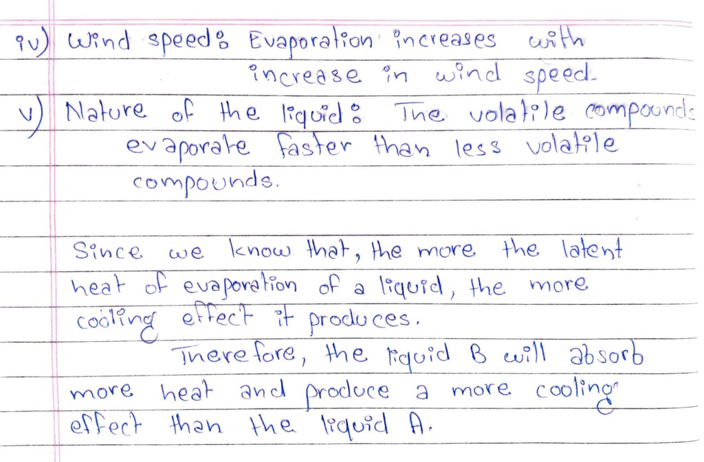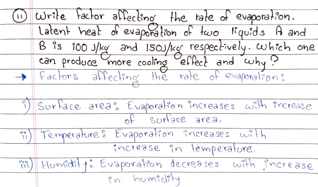 Q11. Discuss the various factors which affect the rate of evaporation. Latent heat of evaporation of two liquids A and B is 100J/kg and 150J/kg respectively. Which one can produce more cooling effect and why?