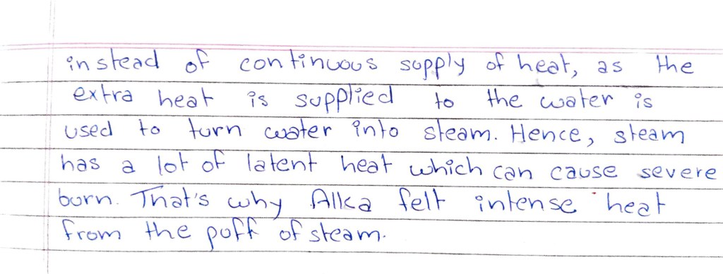 Q5. Alka was making tea in a kettle. Suddenly she felt intense heat from the puff of steam gushing out of the spout of the kettle. She wondered whether the temperature of the steam was higher than that of the water boiling in the kettle. Comment.